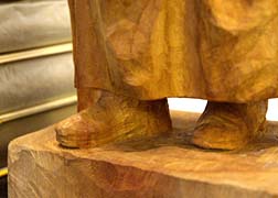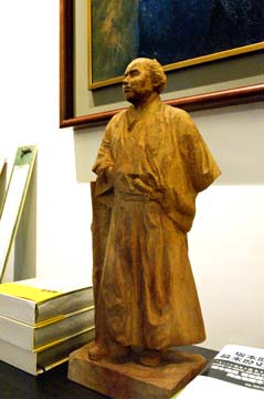 | 李登輝さん正面にある、自身の自画像下にある、「竜馬」の木彫り人形を指差し、竜馬について語りだされた。ちなみにこの木彫り人形は、高知を訪ねていただいたものだそうだ。革靴を履いているところに竜馬を感じさせるという李登輝氏であった。 |