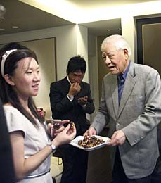 上機嫌で話し続ける、李登輝さん。もうこの場を止められるのは、ご本人しかいない。 そのような状況で、突然立ち上がり、テーブルの上にあるお菓子の皿を持って「まあ、食べなさい」