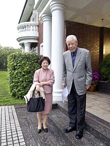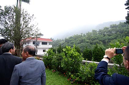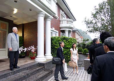 「撮影会?を終え玄関まで見送りに出てこられた、李登輝さんと訪問団皆が、遠方一点を見つめているのは、この邸宅の前がちょっとした渓谷になっており、対岸の山にテレビ局のカメラがあるらしく、それに向け、皆が応えているもの。 確かに、対岸から見張っていれば、誰が訪問したか分ることになる。 |