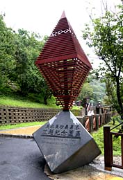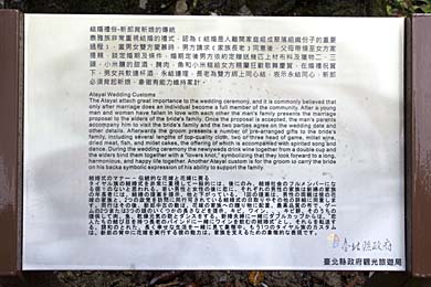 高砂義勇軍慰霊碑に行く途中、男性が女性を背負子で背負う銅像があった。その下に説明文が刻まれたプレートがある。日本語もあったが、どうも文法がおかしい。 いずれにしてもタイヤル族の結婚儀式のようである。民族衣装を纏い、逞しい新郎が、新婦を背負い新居へ向かうのだろうか。この新婦、素晴しく美形である。本当かどうか不明だが、パンフレットには、タイヤル族は美人が多いと表記されている。 日本だったらフェミニストから文句が出そうだ。
