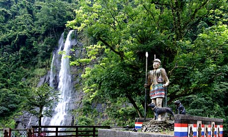 ↑烏来の滝と犬を引き連れた高砂族(タイヤル族)の木像。