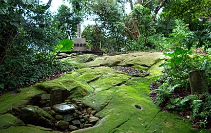 更に奥へ進むと、それまでの朱色基調の景色からガラリと雰囲気が変わり、苔むす岩盤の奥に六氏先生のお墓が見えてきました。 |