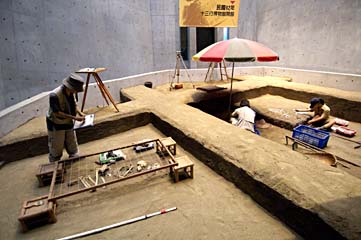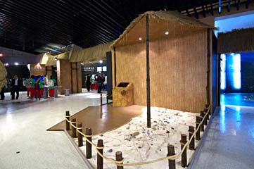 全体としては精密なジオラマを駆使した展示法を用いている。写真上左は、発掘風景を再現したもの。 |