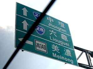 美濃鎮は高雄県に属し、「鎮」は日本でいう「市」のようなもの。(台北市や高雄市は県と同じ)つまり地名は「美濃」になります。もともと「瀰濃」だったところ、日本統治時代に美濃・大垣出身、磯貝静蔵が知事を務め、大垣出身の高橋辰次郎工学博士がダム建設を行ったことから「美濃」になったそうです。また、台湾の「美濃」は、山川などの自然に恵まれ、岐阜の和傘に似た傘の産地。この標識を見ると岐阜県美濃地方を走っている気になります。