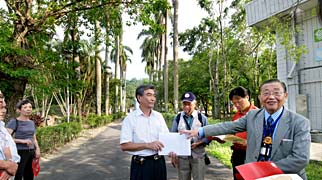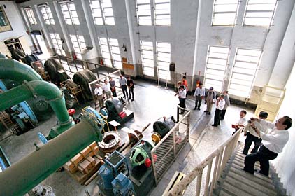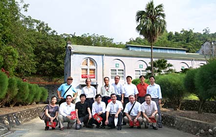 明治42年(1909年)に建設された、竹仔門電廠(発電所)を見学。写真中央は、台湾電力公司高屏発電廠所鍾所長。発電用に流れる水は美濃一帯を潤し、荒地が農作地帯となり、早期に電力を確保した高屏・台南地区の商工業の迅速な成長と高雄の近代化を促した。