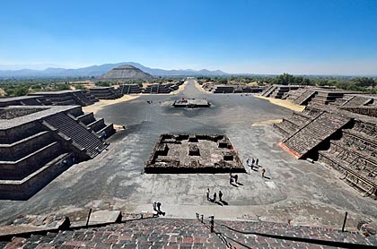 右の写真は、月のピラミッドから見下ろした広場の全景。正面ステージを中心に、左右に配置されているのは今でいう観覧席とされ、各部族がここに集まり何らかの儀式が行われたと推測されています。