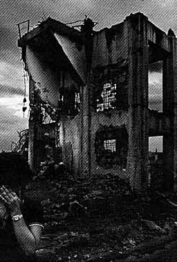 | 右の写真は、ある記事に合わせて撮影したものである。 残念ながら、HDが故障して元データが消失したため、印 刷されたものしかないので、元写真との比較が出来ない。 さて、この場面だが、瀬戸市の工場解体現場を通りか かったときに同行のライターさんにモデルになってもらい 撮影したものである。ライターさんいわく、この場所を見 ただけでメディアを通して見る戦場のイメージと重なるそ うだが、実際に戦争を見たことがない我々の世代では、メ ディアの戦場とビル解体現場は、印象で重複することを意 味する。 これが、白黒写真となって暗部を黒くつぶし印刷した紙 面で見せると大半の人が、戦場跡地、と答えた。私自身、 子供の頃、近くにある軍需工場跡地が、空襲を受けたまま の状態で何年か放置されていたので経年はあるものの「空 襲後の景色」の実物は見た経験がある。 そこでこの写真をそのときの建物の質感に近付けるよう にトーン調整をしたのだが、おそらく、建築や軍事の専門 家がこの写真を検証すれば、爆撃や砲撃の壊れ方とビル解 体での壊れ方では違うことを見分けることが出来るであろ う。 しかし、世論に訴える場合、全く戦争に縁のない人 たちが、戦場跡地の写真として見せられたときなどは、印 象や同情などが脳裏を支配し、検証することなく感情で肯 定しかねない場合もある。プロパガンダ写真は、そのよう な作用で世論を味方につけるために作られる写真であり、 検証なく同調し、正論を伏せてしまうことに知らず知らず 加担することのないようにこの写真が、理解の材料となれ ば幸いである。 |
